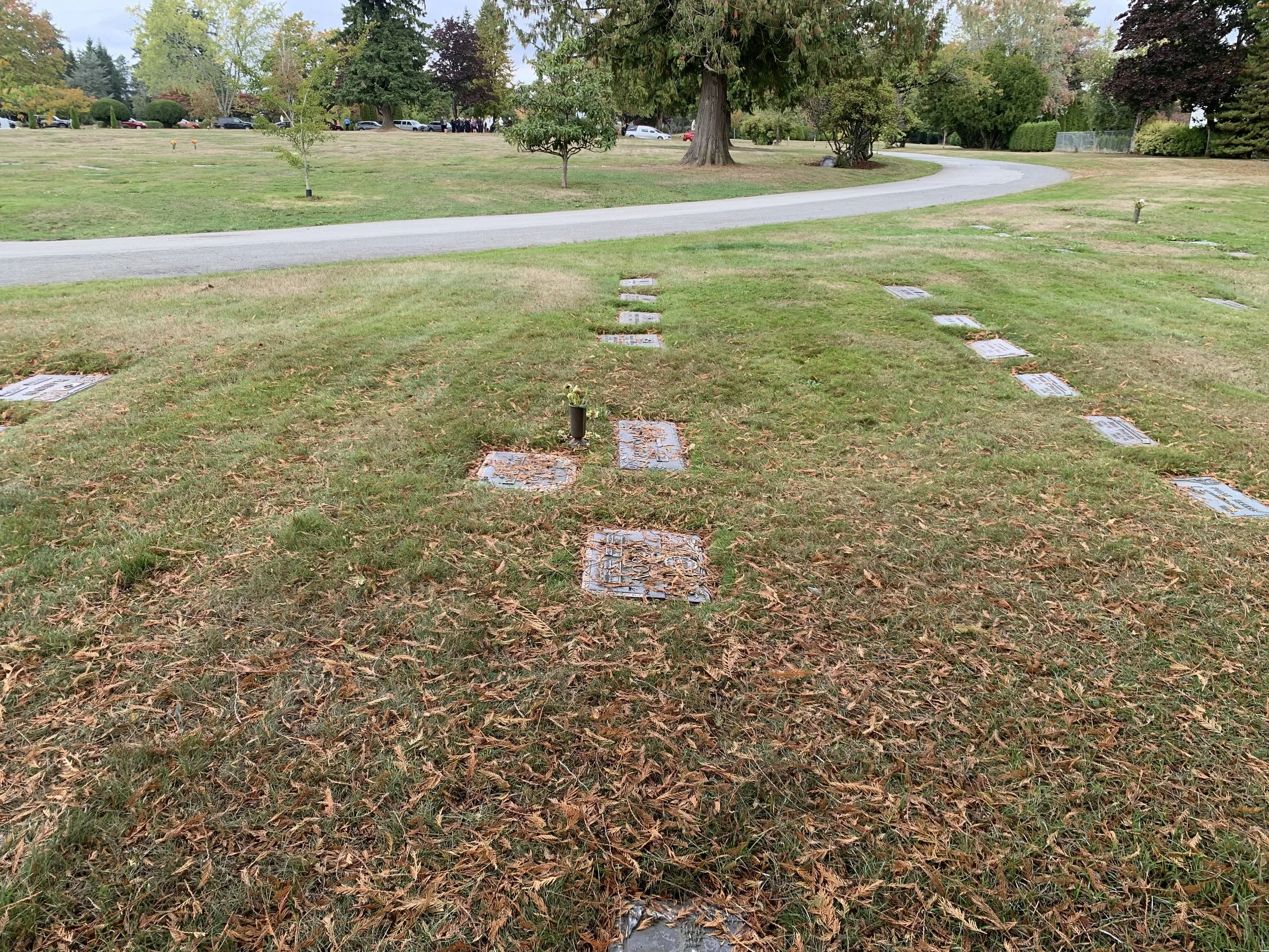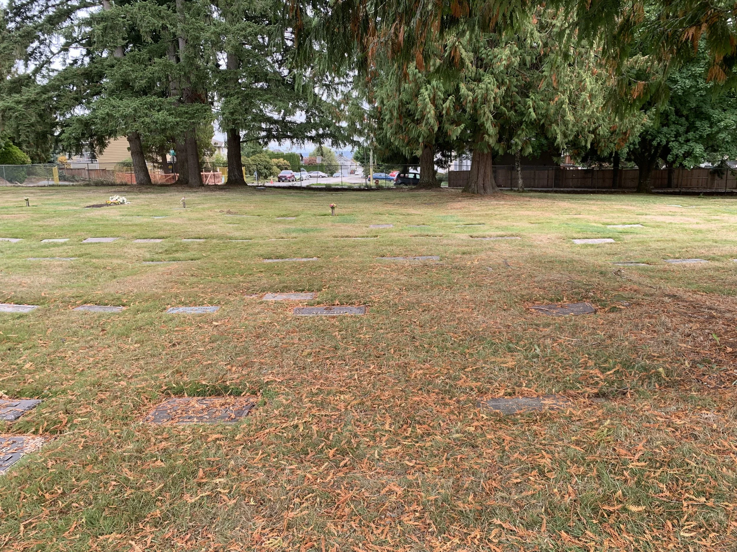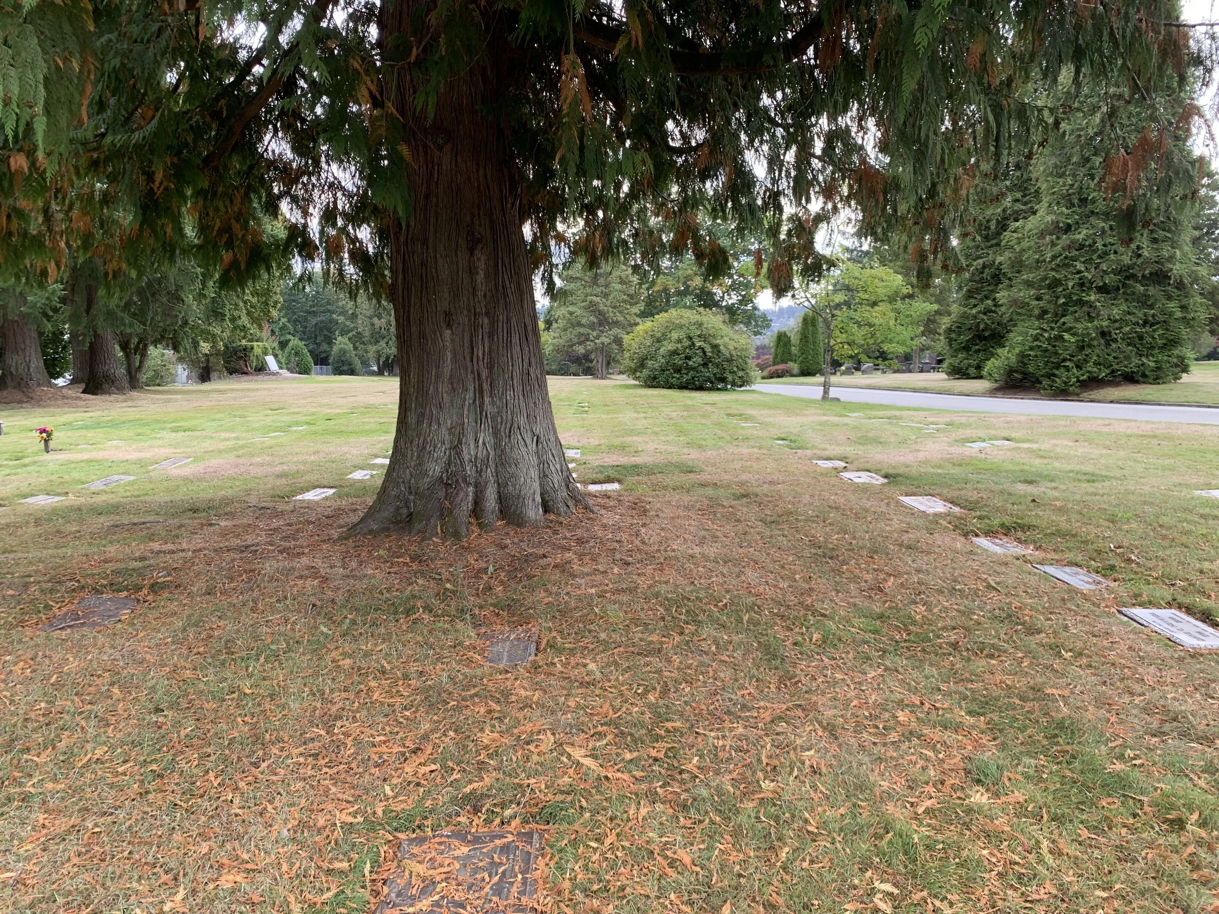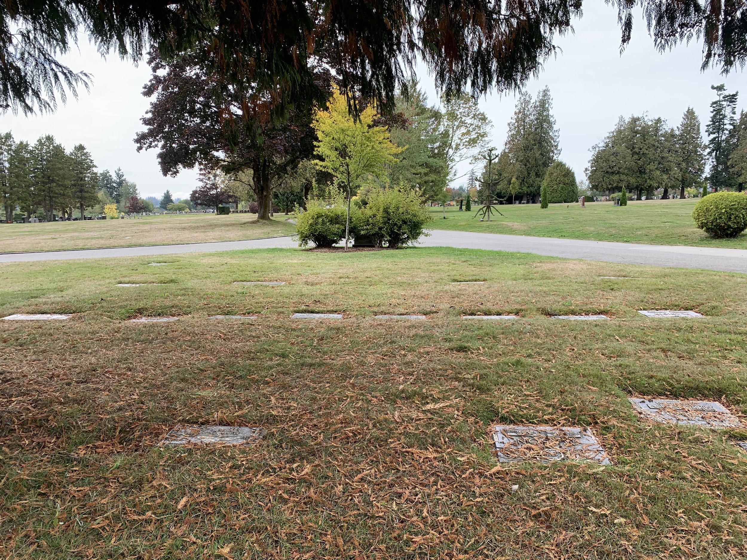 In the shade of a mighty evergreen, this full-size burial plot allows traditional burial of one casket. In the southeast area of the park. Bronze memorials (not included) level with the ground permitted.